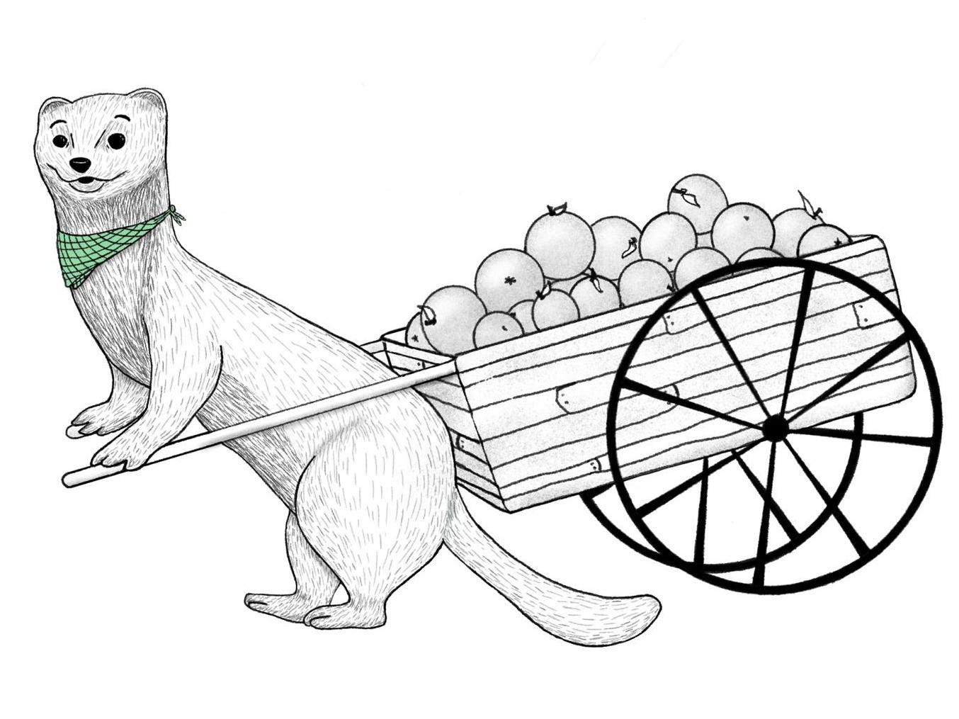 I was glancing through your children’s illustrations and I spotted the, I want to say it’s a stoat, but it may be a weasel, a marten, a mink, not sure. But there’s some kind of, there’s a creature that’s pulling a cart full of apples and he’s got this little expression on his face as if to say, well, hi. He’s got such a friendliness that just made me grin straight away. Does he have a name?