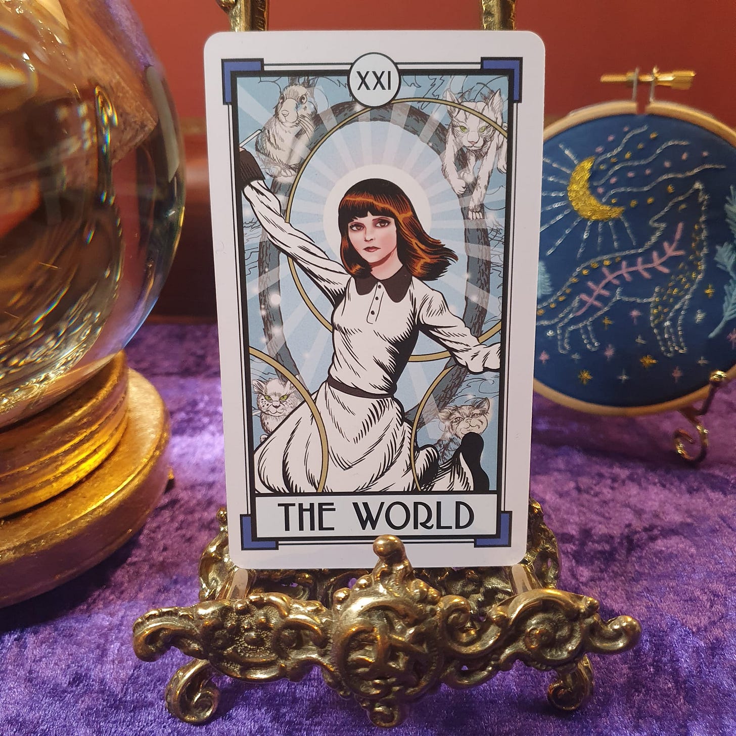 You are very kind, especially as with this being the new month, we have The World as the theme. So that’s going to be your first card. We’ll come to that shortly. But it also means we’re using a new deck. And the deck we’re using tonight is Christina Ricci’s Cat Full of Spiders tarot deck, which is as peculiar as it sounds.